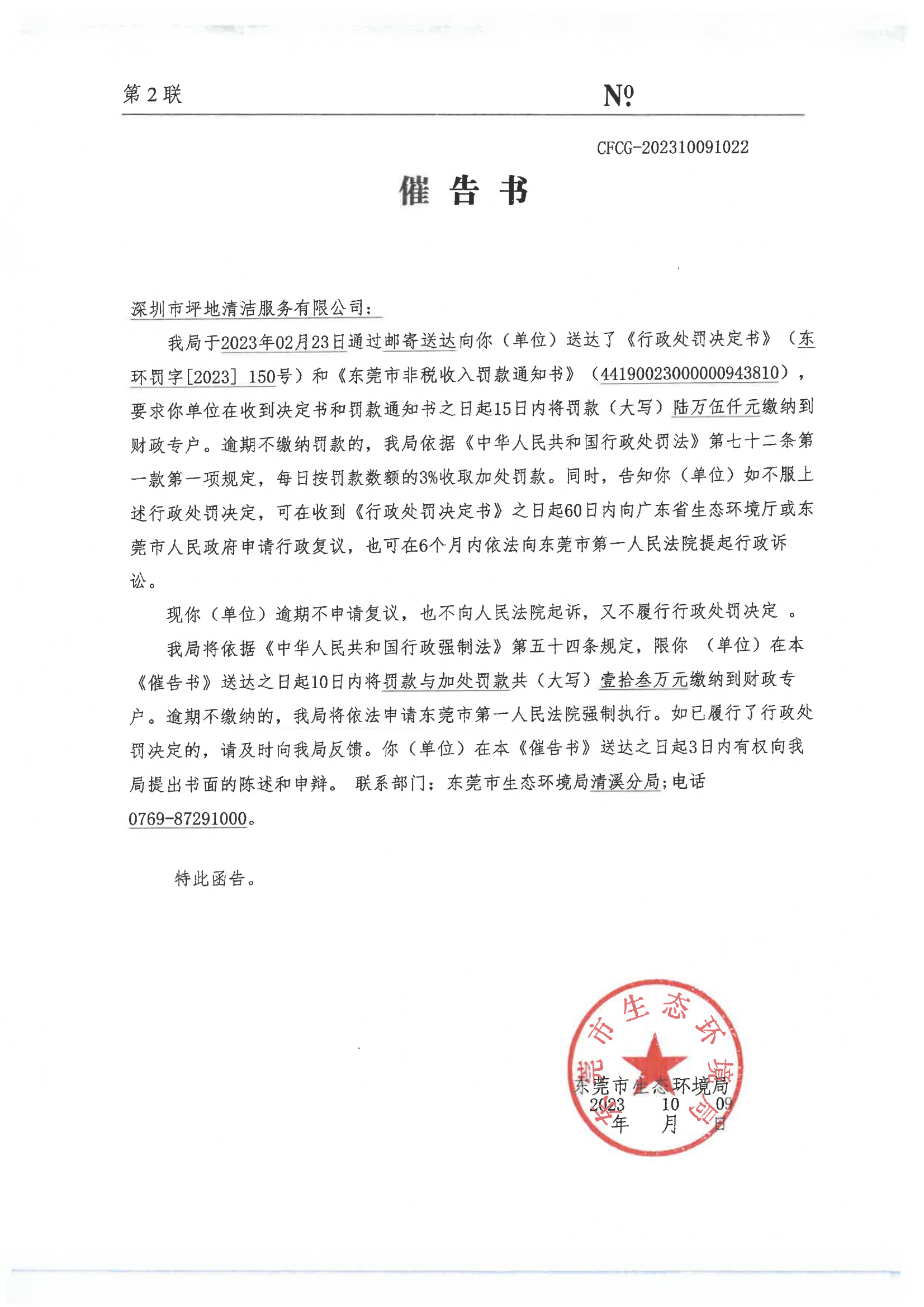 行政处罚催告书公告(深圳市坪地清洁服务有限公司、CFCG-202310091022)