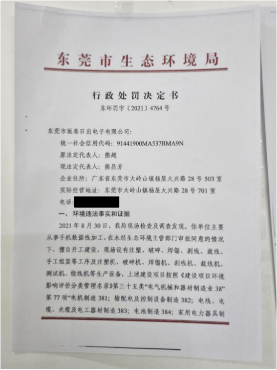 行政处罚决定书公告(东莞市坂卷日出电子有限公司、东环罚字[2021]4764号)